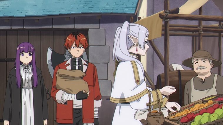 セリフはほとんどなく、環境音とBGMだけで描かれるんですが、フリーレンが淡々と野菜、果物、パン、服、ろうそくを買う一方で、その都度シュタルクは荷物を大量に持たされます!