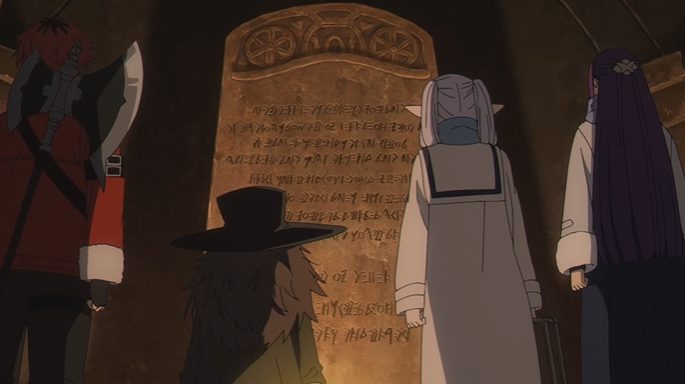 碑文はミリアルデのとんでもない暇つぶしと話すフリーレン。