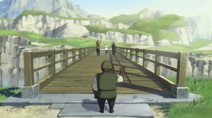 たった一人で巨大な丸太を運び、石を削り、橋を作り続けるゲーエン。その地道な作業風景が丁寧に描かれます。